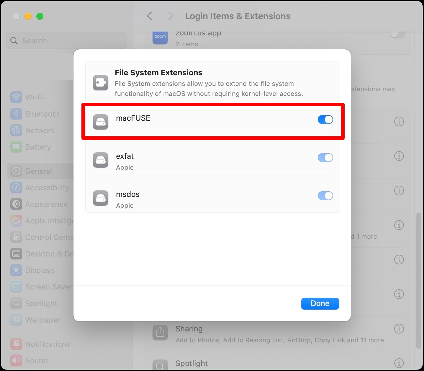 (i)next to File System Extensions.- Activate the slider for macFuse and click Done.