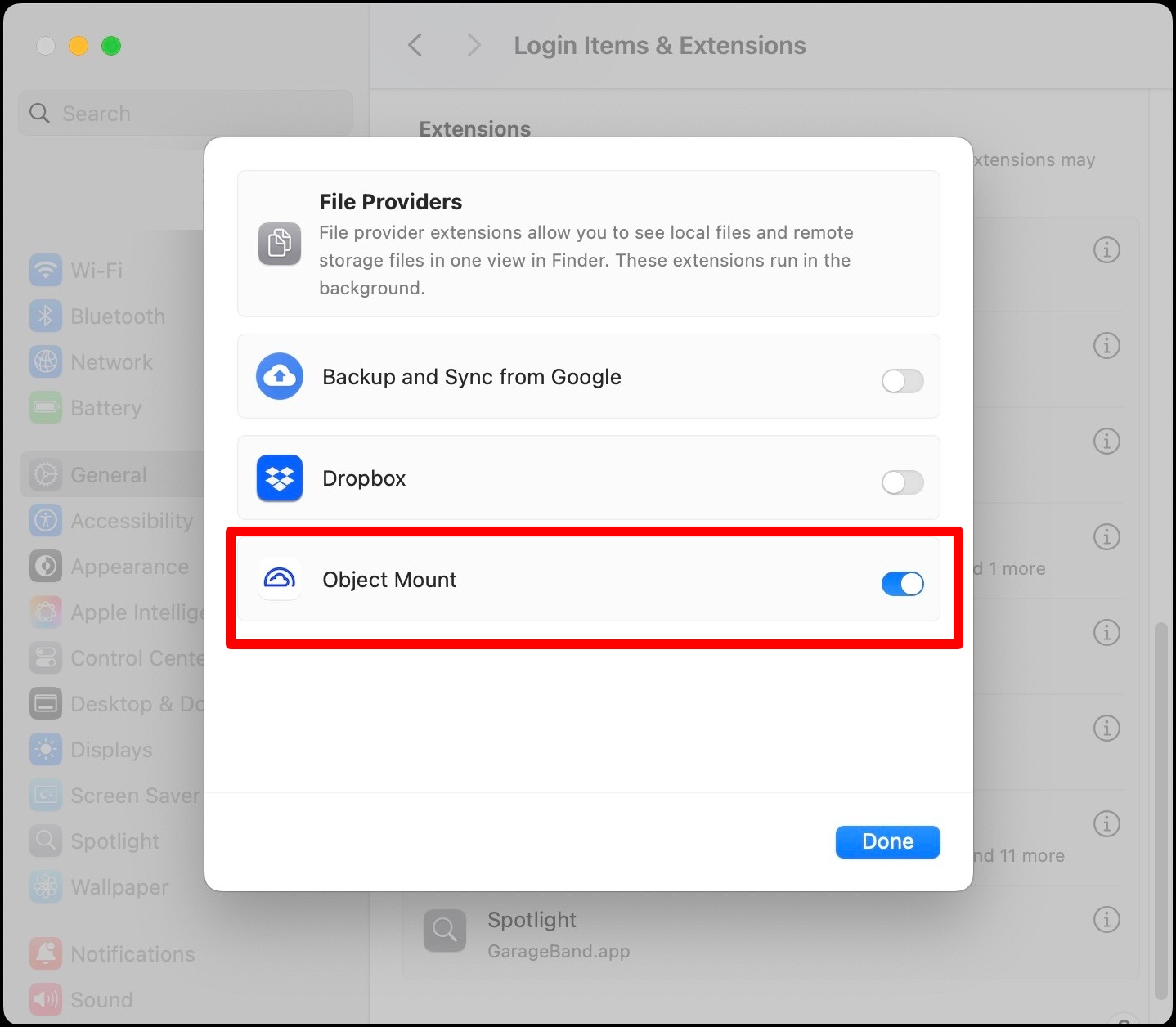 (i)next to File Providers.- Activate the slider for Object Mount and click Done.