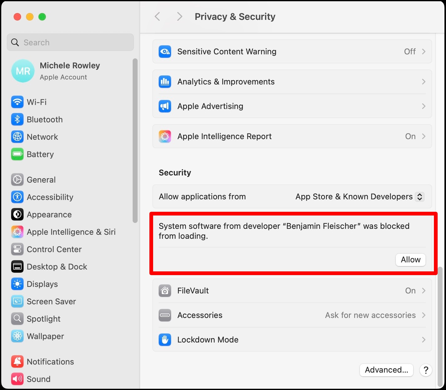 - Click Allow to permit the macFUSE extension (from developer âBenjamin Fleischerâ) to be loaded