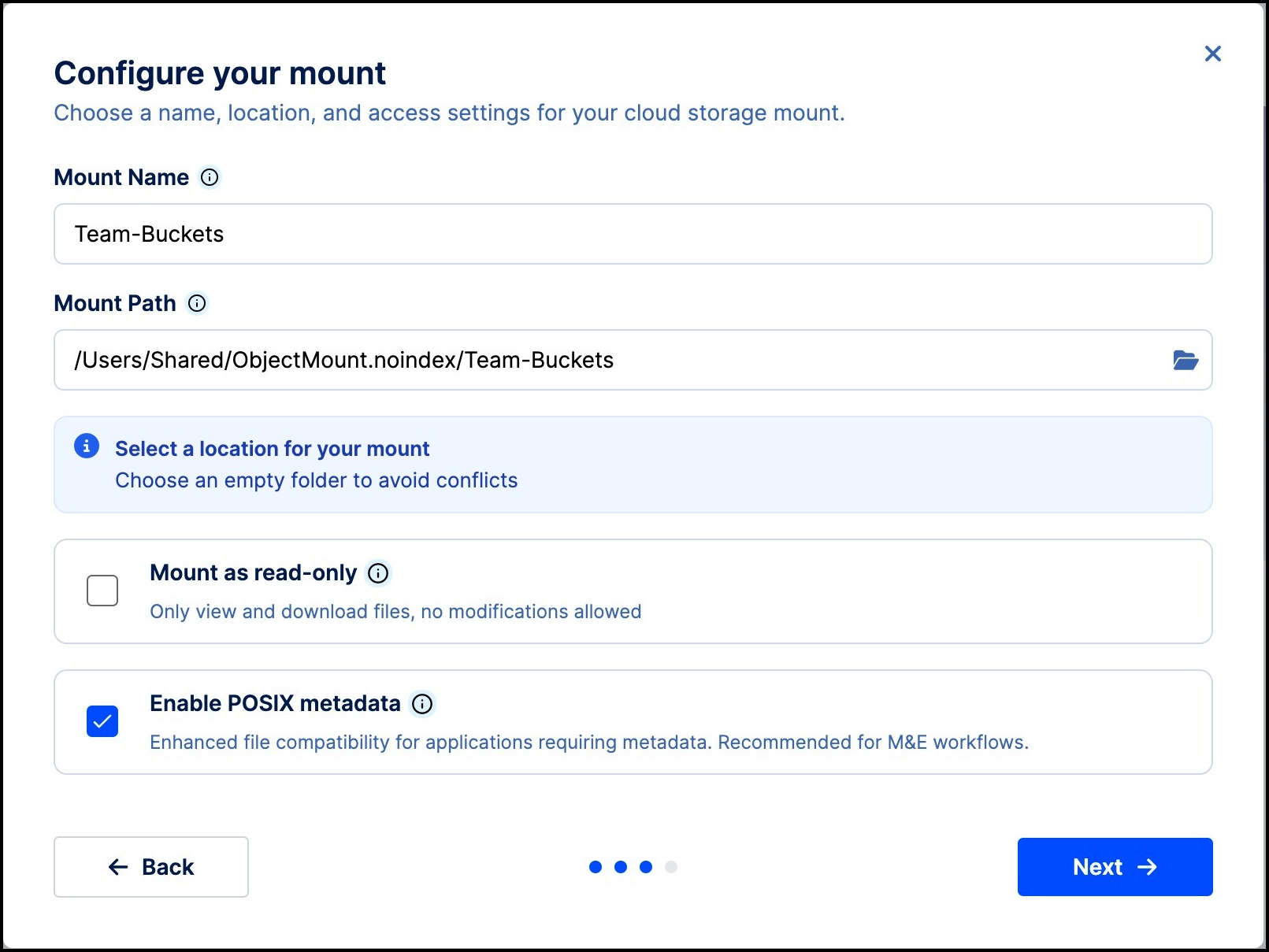 Tick the box to Enable POSIX metadata (recommended).
