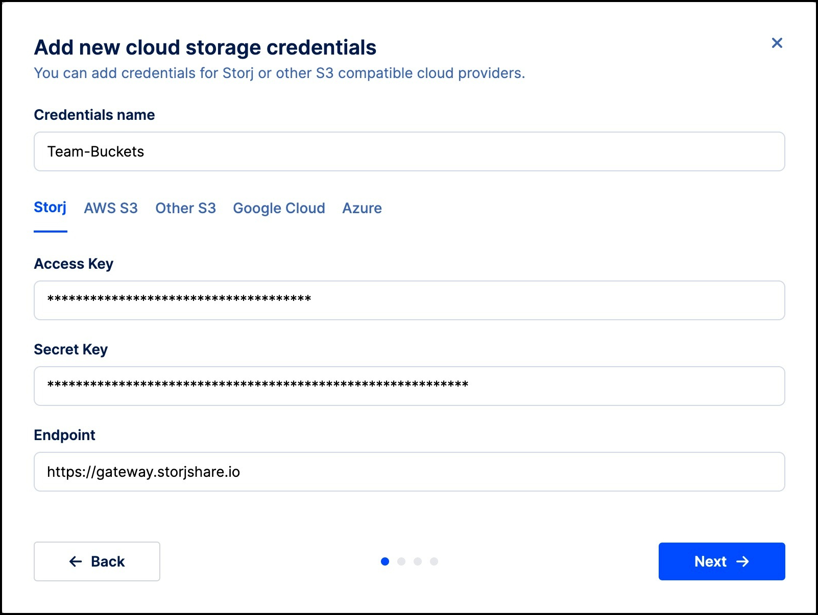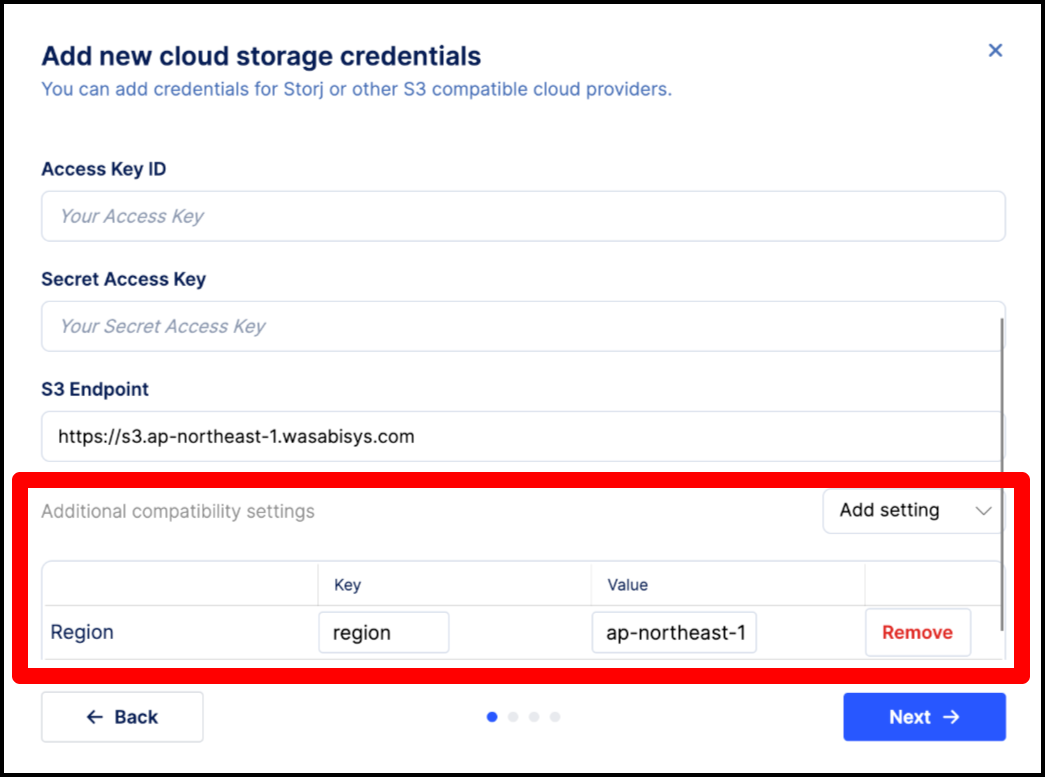 - Enter the Access key ID, Secret key, and Endpoint (or Region, if applicable) that you obtained earlier.