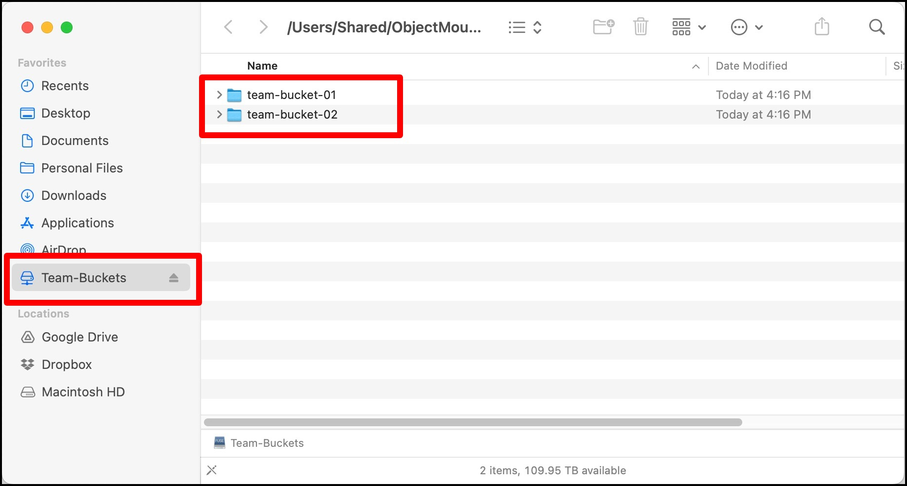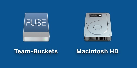 If there are multiple buckets accessible using the same credential set, those buckets will each appear as separate folders within the single mounted drive icon: