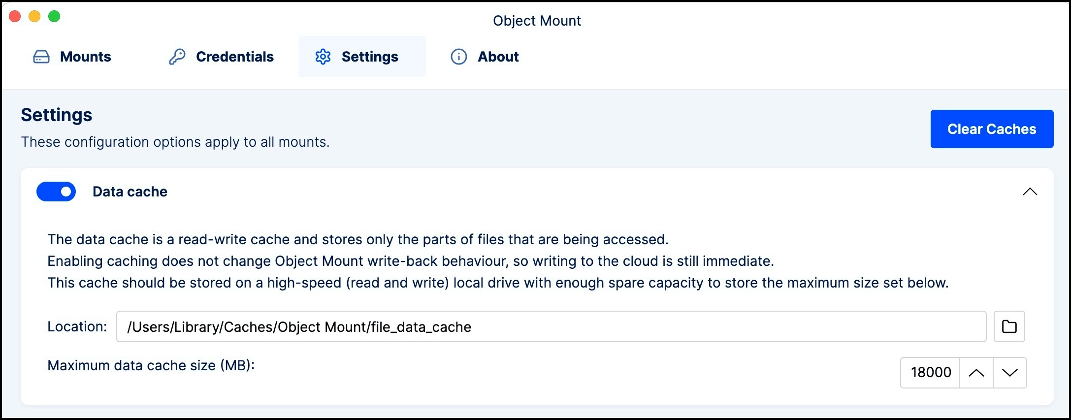 Object Mount for macOS includes a flexible Settings panel where you can fine-tune caching, logging, and performance settings.