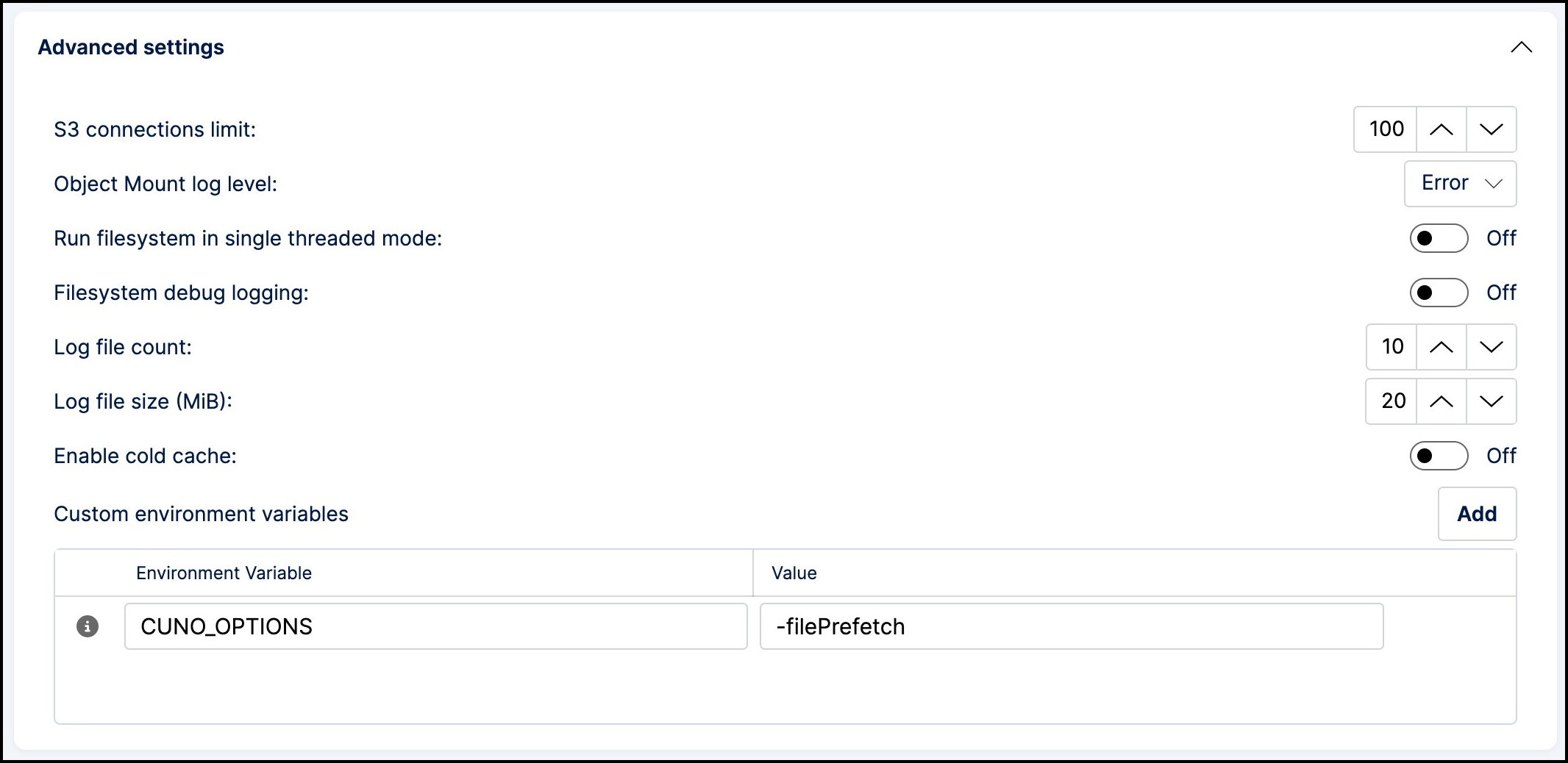 | Custom Environment Variables | Custom variables to modify Object Mountâs behavior, add variables when recommended by Storj Support. |